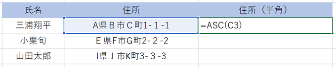 =ASC(半角に変更したいセルを選択)