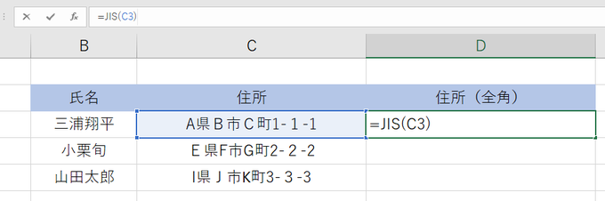 =JIS(全角に変えたいセルを選択)