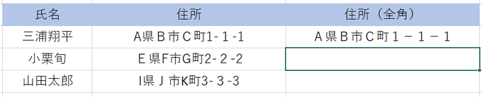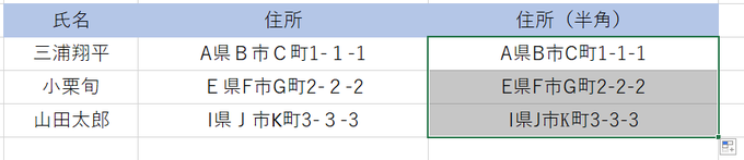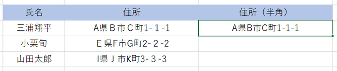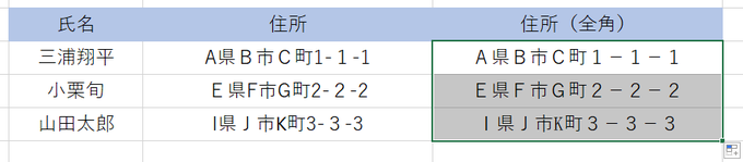 上記の表の住所が全角と半角がバラバラになっています。
